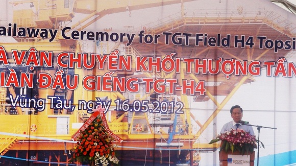 Các đại diện lãnh đạo các bên hữu quan đã tiến hành cắt băng sẵn sàng cho việc vận chuyển Khối thượng tầng H4 tới vị trí của Mỏ TGT. Trước đó, 15/5/2012 việc hạ thuỷ Khối Thượng Tầng H4 đã được tiến hành thành công.